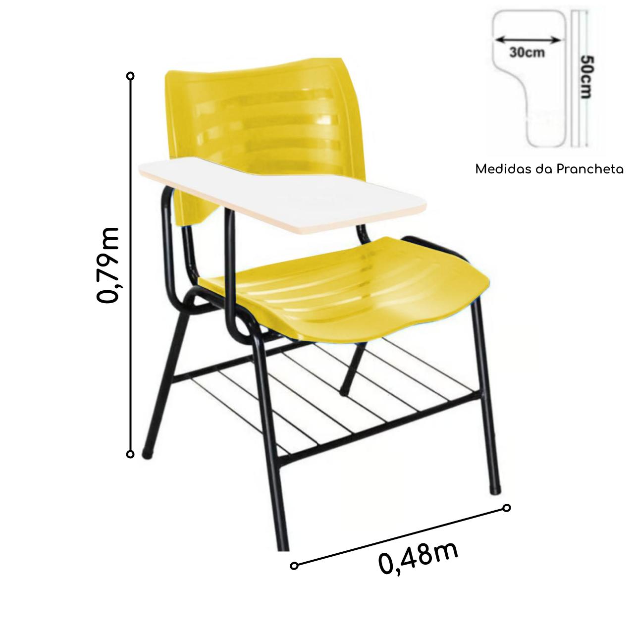 Mais informações: Prancheta em madeira, Assento e encosto em polipropileno, Base de aço com pintura eletrostática (montável), Porta Livros.
